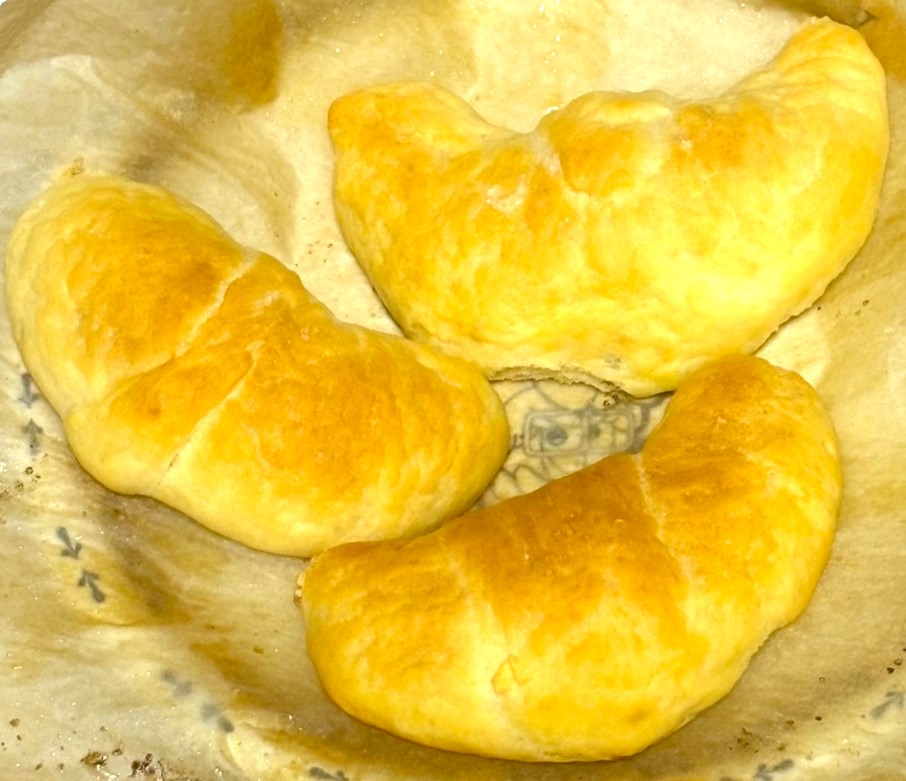 そして、こちらが今回の塩パンです!見た目も美しく、香ばしい香りが漂っています。焼き色も均一で、前回の失敗を見事に克服できました。