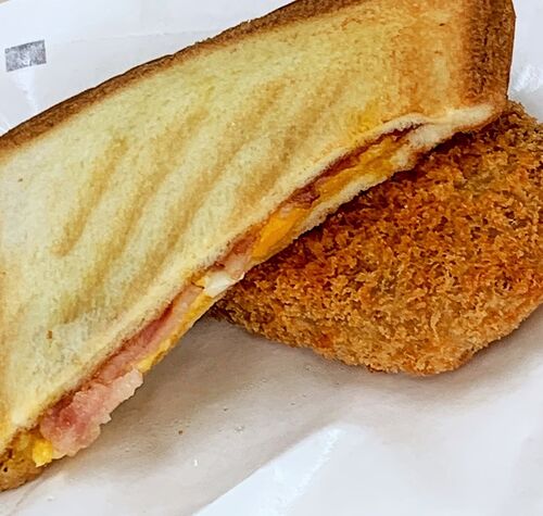 ベーコンエッグホットサンドとファミコロ(コロッケ)です。 ファミリーマートのホットサンドは、お店のオーブンで焼き直してくれるのがいいですね。アツアツが美味しいです。 ファミコロの下味は気になりますね。和風だしのようにも感じるので味付けのレシ…